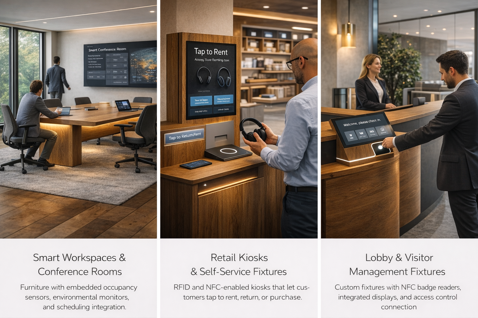 The result: physical spaces that participate in your digital operations. Conference rooms that know when they are actually occupied. Retail fixtures that track inventory in real time. Lobby stations that integrate with your building access and calendar systems. Every piece is designed for your brand, your workflows, and your data requirements.